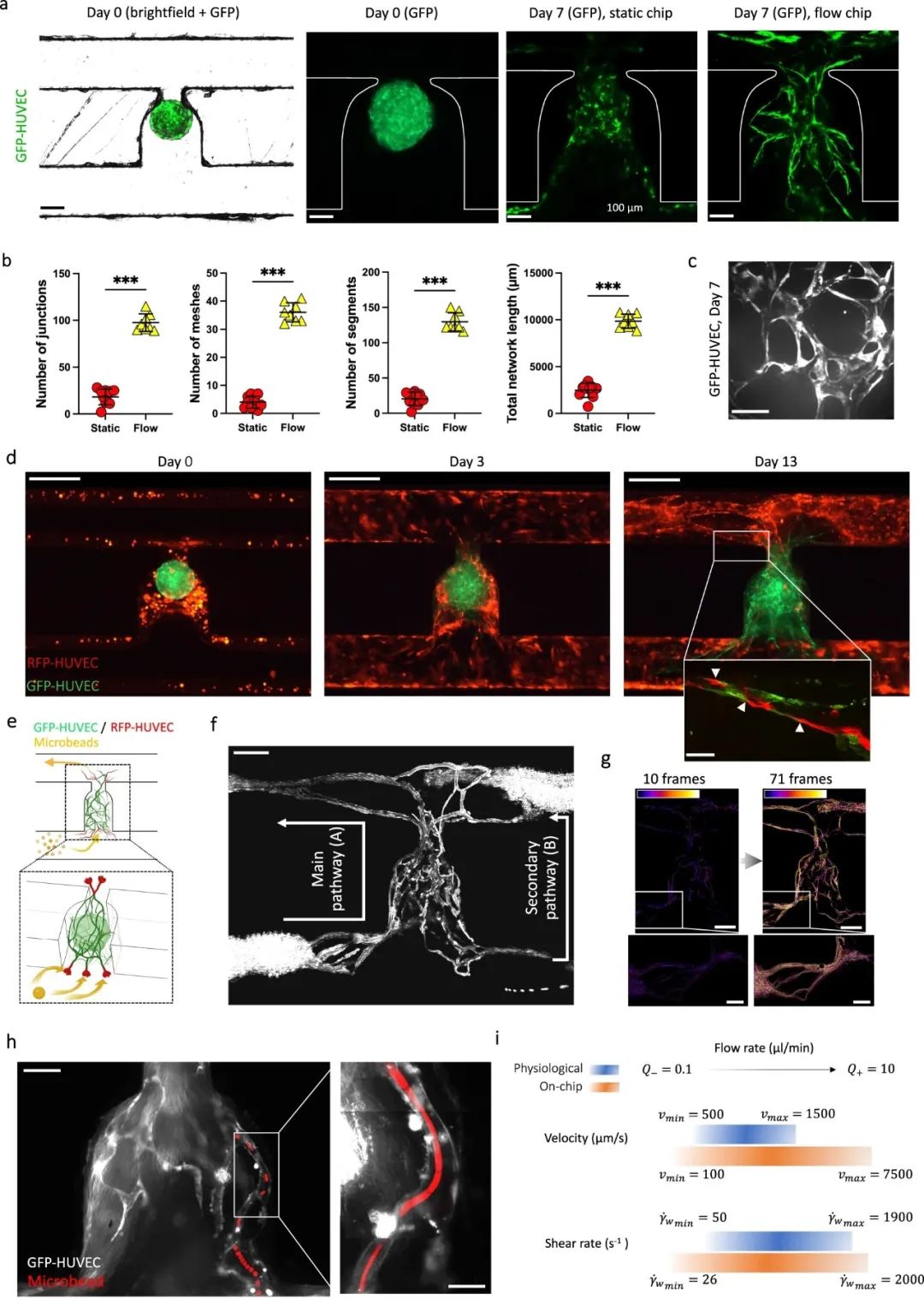 首先通过在静态(每天更换培养基)或流动条件下单独培养间充质球体来检查流体流动的影响。观察到动态灌注下内皮网络的形成增强,与静态条件相比,血管连接处数量、网孔数量、节段数和总节段长度分别显着增加4.4倍、6.5倍、5.0倍和4.8倍。因此,流动条件可以直接驱动这些间充质球状体分化为血管状结构。接下来将HUVEC掺入水凝胶混合物中(如上所述),以在HUVEC衬里微通道和捕获的间充质球体之间建立功能连接。在第0天,间充质球状体被引入微通道并捕获在正确的位置,在那里它保持其球形。在第3天,研究者观察到内皮细胞的初始组织,到第7天,具有三维构型的网络样结构发育并保持稳定直到第13天。观察到RFP-HUVEC内皮床和间充质球体脉管系统之间的自发吻合,在陷阱站点上建立互连网络。为了证明相互连接的内皮网络的功能,研究者使用荧光微珠进行了灌注测定。在培养的第13天,将直径为1μm的珠子以Q = 10μl/ min的流速注入微通道中。珠子示踪覆盖在内皮网络从陷阱入口到出口产生的图案上,表明形成的网络支持灌注的能力。最后通过对网络中的流体性质进行表征,发现器官芯片中的灌注类似于人体毛细胞血管中观察到的生理流。