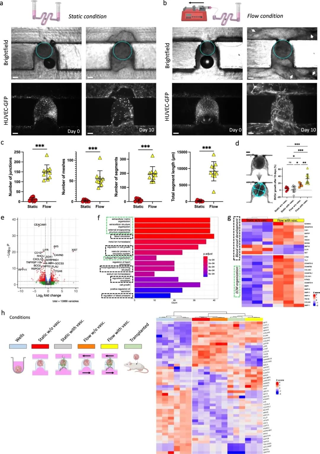 为了证明该方法在解决该领域有关通过血管化改善3D组织生长和功能的关键问题的适用性,研究者进行了实验,比较了在静态和流动条件下的类器官生长,以及有或没有相邻的HUVEC内皮床(分别称为“有血管”和“无血管”)。反复拍摄明场和GFP荧光图像,以观察BVOs和周围内皮网络的发展。在没有HUVEC和成纤维细胞的纤维蛋白水凝胶中培养的BVOs显示出生长受损,导致凝胶降解,BVO收缩和过早死亡。当在相同条件下在孔中培养时,这些BVO的生长和发芽不受影响,因为它们被封装在大量凝胶中,在培养的最初几天可以防止任何凝胶降解。与流动条件相比,HUVEC内皮网络在静态条件下未能正常成熟。ECM重塑在流动条件下显著增强,导致结构的形成,这些结构随着时间的推移在靠近陷阱位点的微通道中逐渐膨胀。相比之下,在静态培养条件下未观察到ECM重塑和血管重组。进行RNA测序,结果显示,在芯片中形成的类器官中有关血管生成、血管发育和血压调节过程中的关键基因均上调明显,这些结果表明,此方法构建的器官芯片提供的灌注和流动可以促进血管类器官成熟。