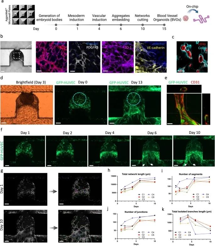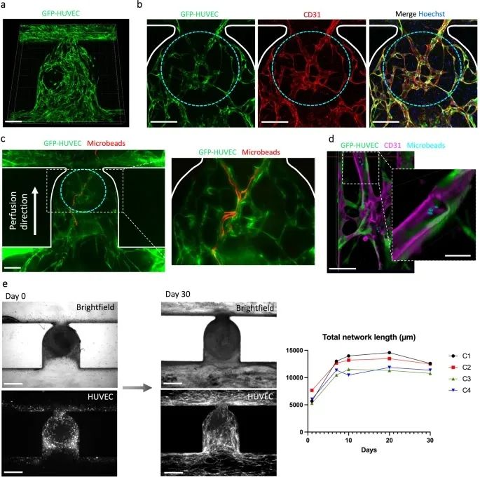 此部分使用人iPSC产生3D类器官(BVO),并植入芯片。与在孔中培养的BVOs类似,这些BVOs在芯片上自组织成真正的毛细血管的三维互连网络,该毛细血管包含内皮细胞内衬的管腔,周细胞和平滑肌细胞覆盖,以及紧密连接蛋白ZO-1和粘附连接蛋白VE-cadherin的表达。类器官形成毛细血管,毛细血管中空管腔被原型基底膜包围。将成熟的BVO、HUVEC和成纤维细胞嵌入水凝胶中并引入微通道。研究者观察到,从第二天到第十天,内皮细胞逐渐组织生成一个互联的网络。这些网络形成了包含BVO的内皮床,并表现出延伸到陷阱位点的三维组织,在2周的实验期结束后,发现HUVEC可以稳定保持30天以上,证明本器官芯片可以形成稳定可灌注的内皮网络并可以将BVO捕获并血管化。